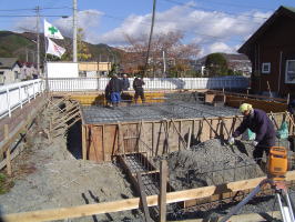 コンクリート打ちです。 象の鼻のようなホースからコンクリートを流し込みます。