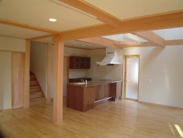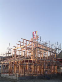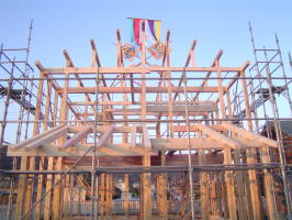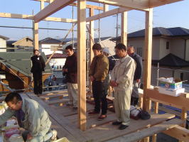 雲ひとつない快晴に恵まれ、上棟式です。 木材も問題なく、組みあがりました。ほっ!! 式も無事に済み、これからの安全も、祈願しました。 みんなで、がんばろー!! 晴れて、本当によかったーー