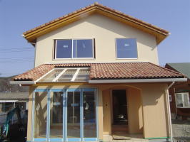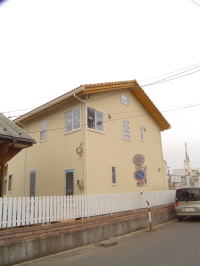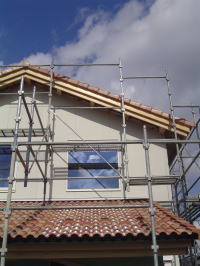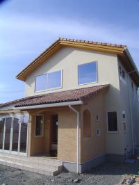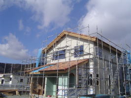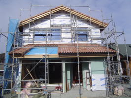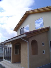 外部足場がようやく外れました。 カワイイ感じに仕上がりました。 あとは、サンルーム周りのコテ塗りです。左官屋さん腕の見せ所!! よろしくお願い致します。